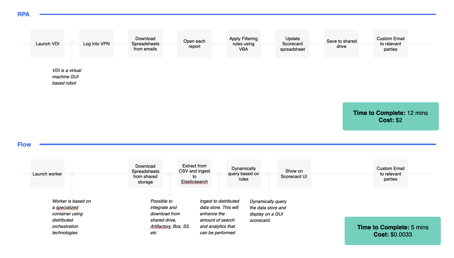 This comparison depicts the same process implemented in Blue Prism and in Boomerang Flow. By adjusting the automated process slightly, it resulted in an overwhelming reduction in cost and a 64% reduction in time. This was a real comparison completed in 2019.